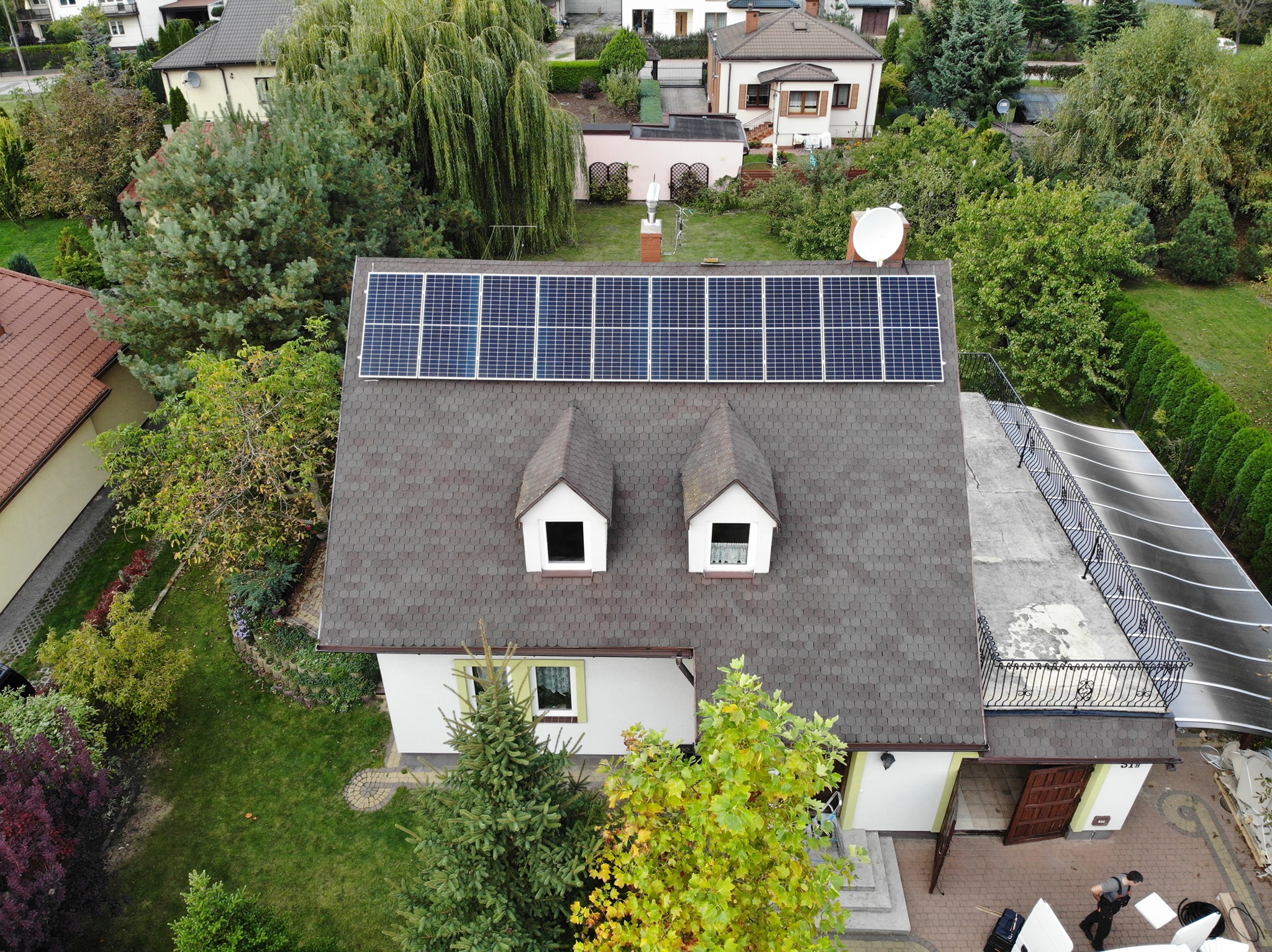 Na zdjęciu nasza kolejna realizacja, efektywnie wpasowana w dostępną powierzchnię. Wysokie drzewa i facjatki nie stanowią problemu przy odpowiednio dobranej mocy paneli i wybraniu odpowiedniego miejsca do ich montażu.